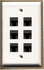 6 port cat5e keystone jack coupler flat wall plate in bright white color with black jacks.